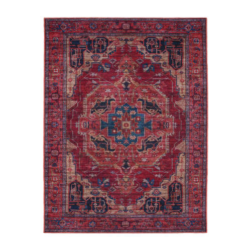 A vibrant red rug designed for indoor use with a smooth low-profile surface. The cotton backing provides durability and comfort, perfect for modern living spaces with underfloor heating.